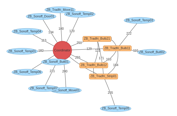 Zigbee is a low-power consumption standard for small meshed local network of wireless devices.