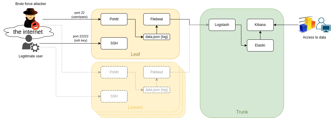 the "leaves" will leverage Pshitt made by regit, a python program that simulates an ssh server with user/pass authentication.